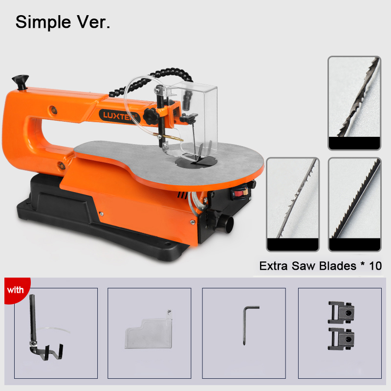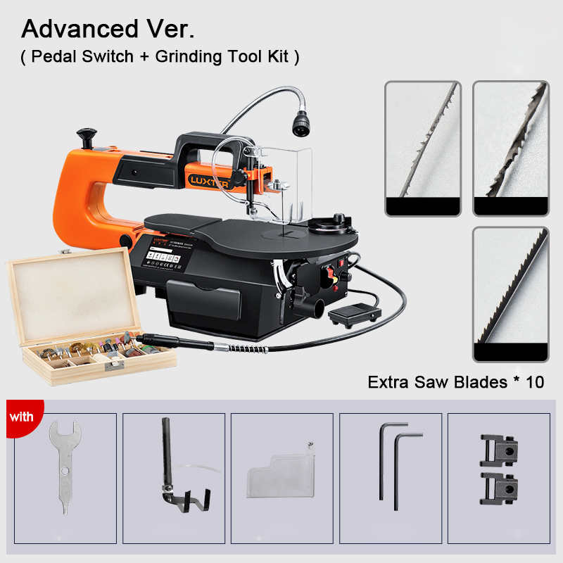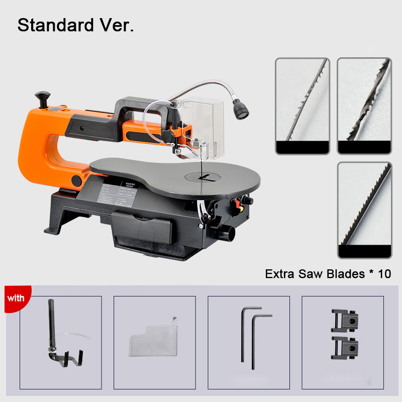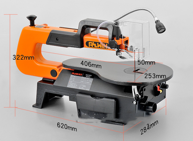 Product information: Voltage/power: 220V 50HZ/120W Cutting speed: 550-1650 RPM Saw blade length: 128-133.3mm Cutting thickness: 50mm (A) Cutting capacity: throat depth 406mm (B) The workbench Angle: 0-45° Foot switch wire length: 1300mm Soft axis length:1065mm Size Information: Packing list: Scroll saw*1(Set) Product Image: